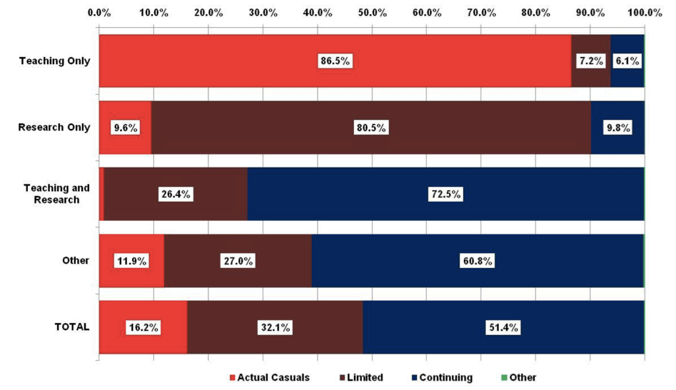 Based upon Fixed Term Equivalent (FTE) rather than headcount, we extrapolated Departmental data (formerly DEEWR, now DIISRTE) to show that around 86.5% of teaching-only academics are casuals and 80.5% of research-only academics are on limited fixed-term contracts. The red and brown landing strips across the top two bars reveal the extent of this problem. Compare this to the extent of secure work in teaching and research and professional (other) employment positions.