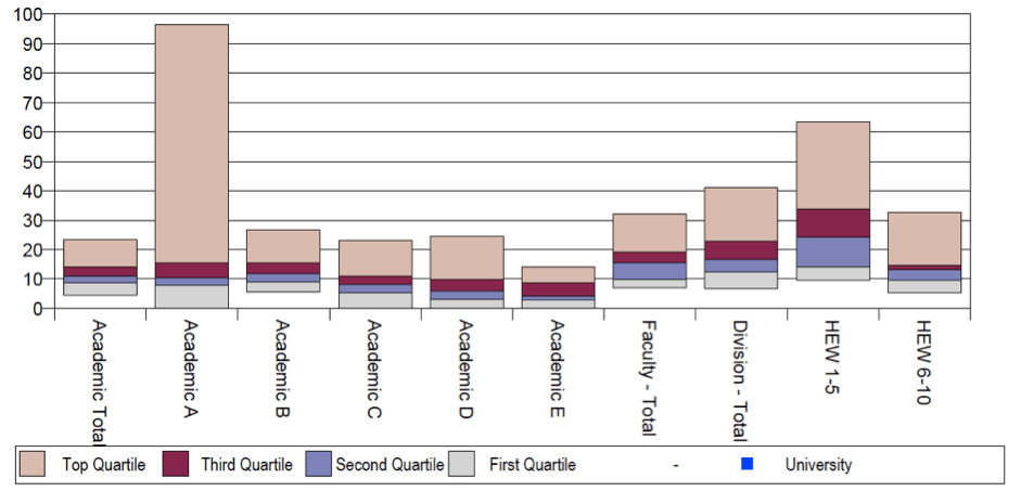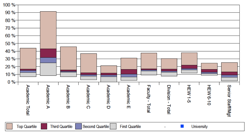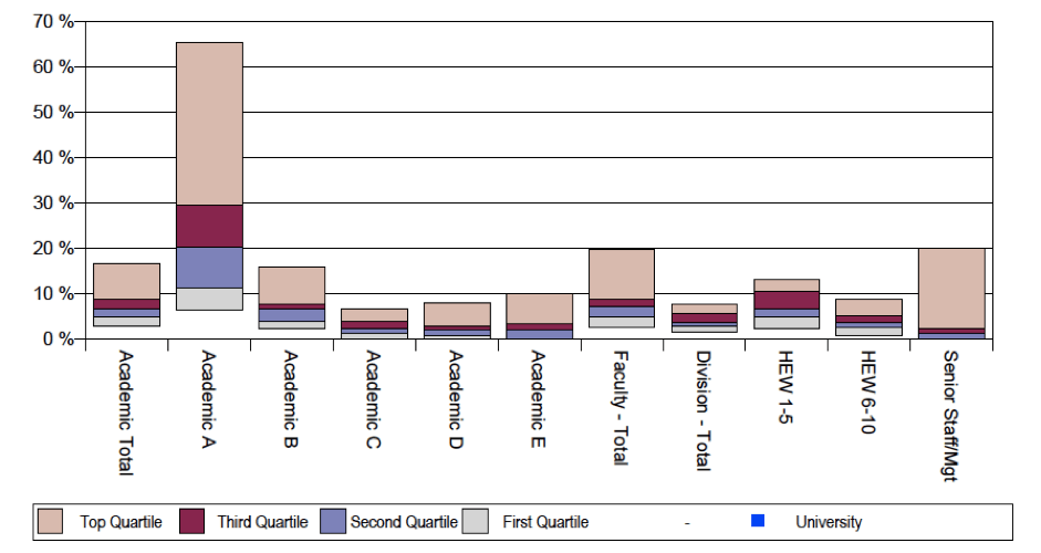 The next one looks at staff turnover, which you can see again is concentrated disproportionately in Academic A with over 90% of Academic As leaving the employment of the university, but this is still high in Academic B (over 45%). Notably, academic turnover is higher than turnover in any other area of the Australian university, be it Faculty, General/Professional or Senior Staff. In another Figure, the Report even identifies that ‘involuntary’ staff turnover is highest in Academic A, and to a lesser extent the Senior Management category.